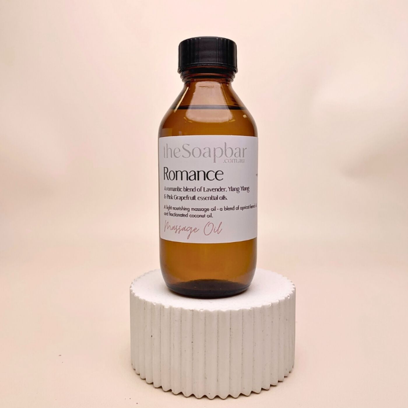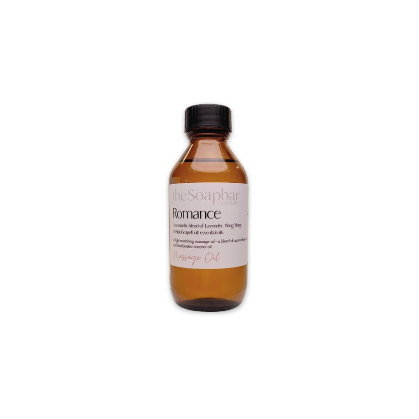 Romance Massage Oil by The Soap Bar in amber glass bottle, made with apricot kernel oil and coconut oil, scented with lavender and ylang ylang essential oils.
