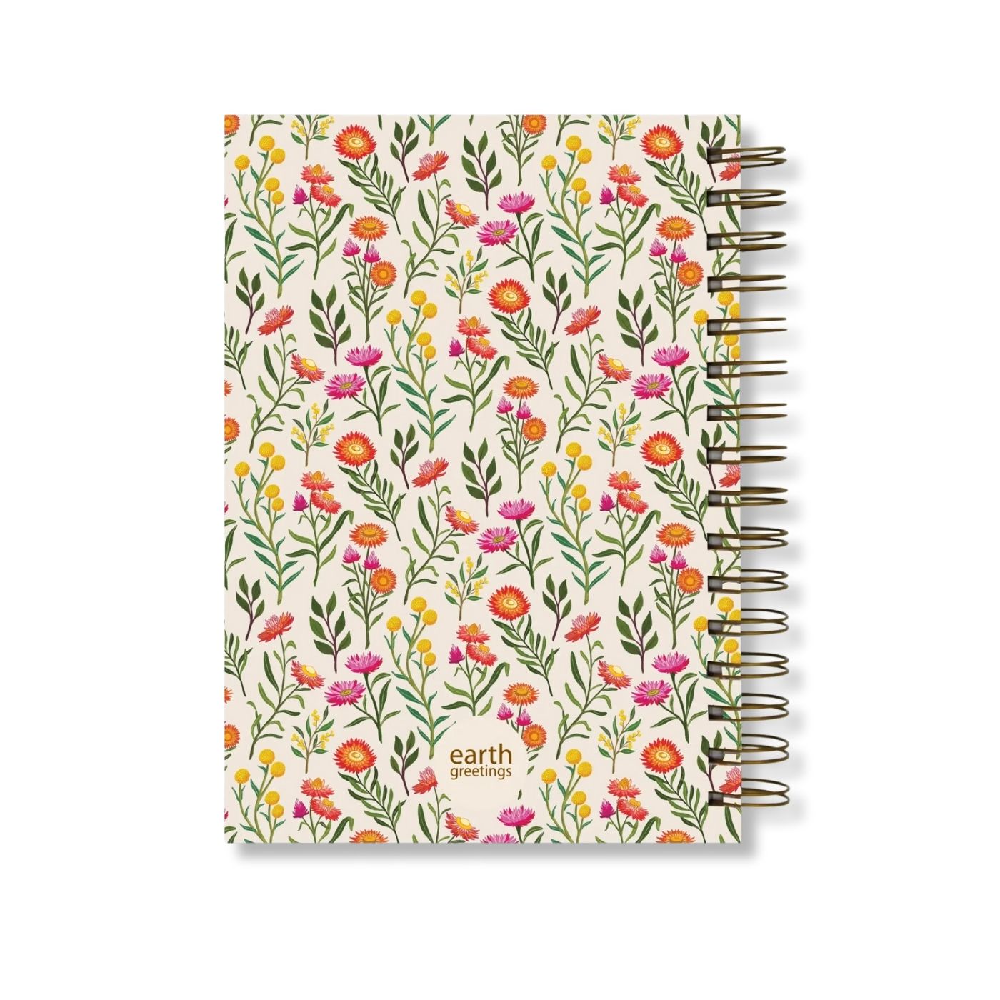 Eco Friendly, Australian Made Lined A5 Journal. Be inspired to pen your thoughts, dreams and stories inside this chunky spiral bound journal. It contains 200 lined pages within a super sturdy hard cover, which features inspiring native floral artwork by Australian artist Negin Maddock.
