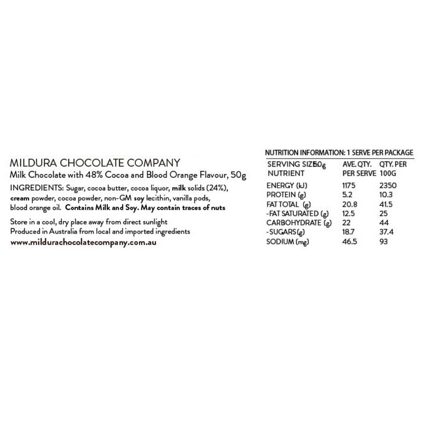 A fusion of premium milk chocolate and subtle blood orange, crafted with a 48% cocoa mass for the perfect balance of creaminess and citrus brightness. This signature blend is Mildura Chocolate Company’s best-seller, adored for its refined flavour and elegant finish.