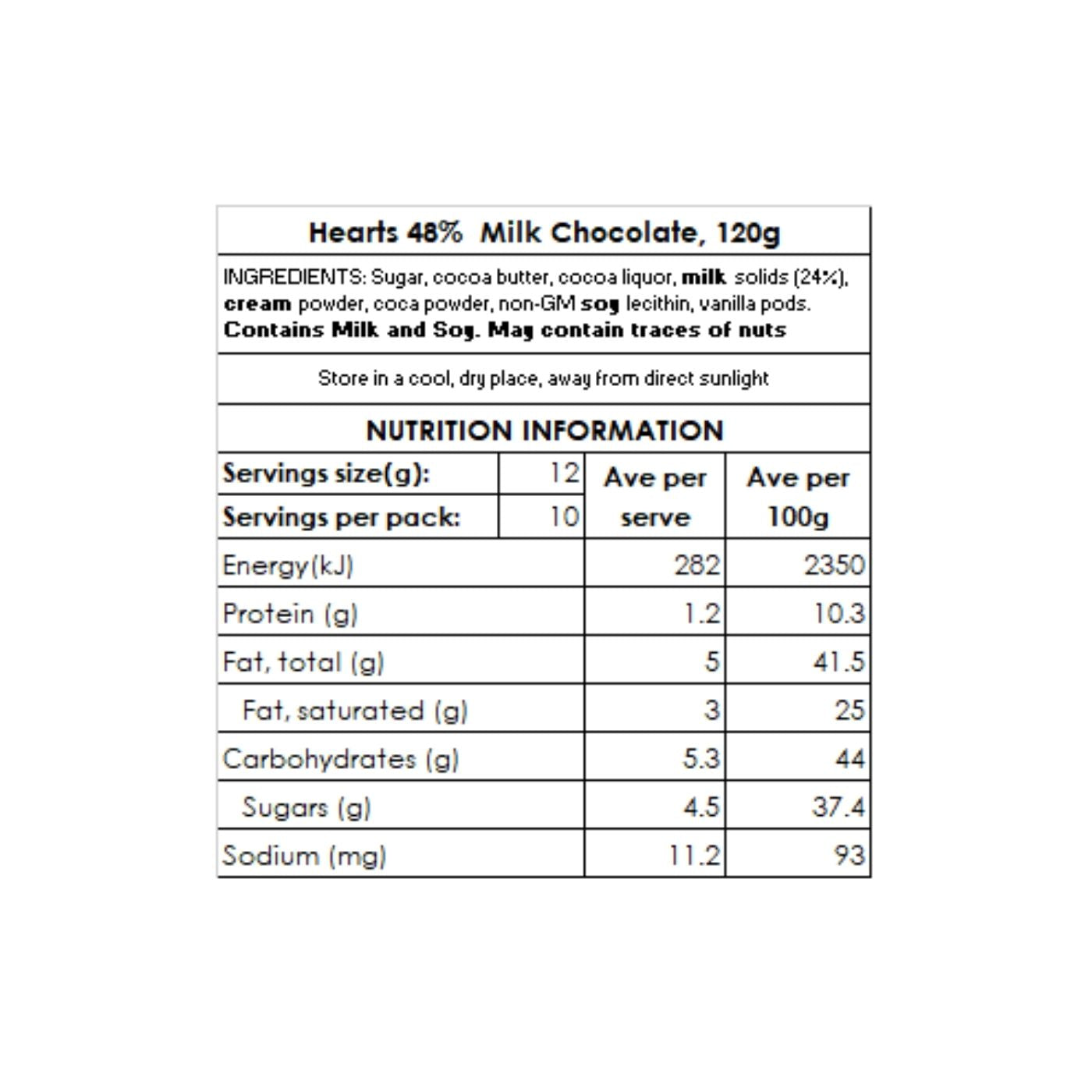 Tiny hearts made from their rich 48% cocoa milk chocolate. Smooth, velvety, and superbly balanced — perfect for nibbling, sharing, or gifting.