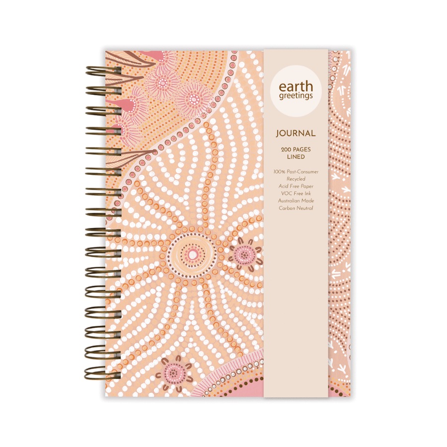 Eco friendly, Australian made lined A5 journal. Be inspired to pen your thoughts, dreams and stories in this Australian made, recycled paper journal. It has a super sturdy hard cover to protect your precious pages, and the front and back covers feature artwork by contemporary Aboriginal artist Domica Hill.