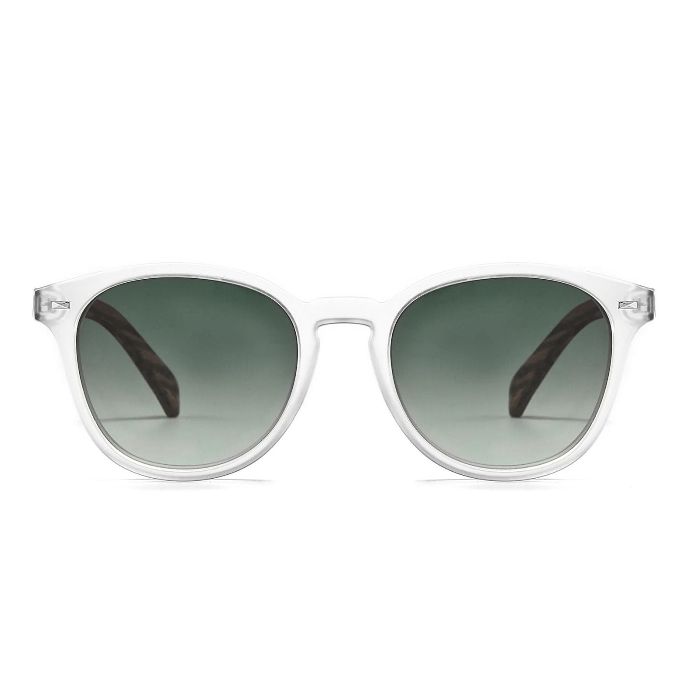 TAINE Frost sunglasses feature a clear frosted frame, khaki polarised lenses, and smooth walnut wood arms. The mid-size shape suits a broad range of face shapes and provides reliable sun protection while maintaining a minimalist, versatile look.